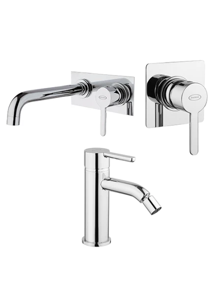 Set rubinetti Jacuzzi per lavabo a parete con piastra, bidet e doccia incasso serie Sunset con rubinetto miscelatore per lavabo a parete con piastra senza scarico art. 0SU00497JA03, rubinetto miscelatore per bidet senza scarico art. 0SU00092JA01 e miscelatore a incasso per doccia art. 0SU00410JA01 finiture cromo.