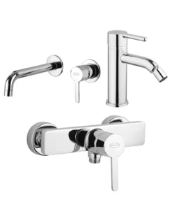 Set rubinetti Jacuzzi per lavabo a parete, bidet e doccia esterno serie Sunset con rubinetto miscelatore per lavabo a parete senza scarico art. 0SU00497JA00, rubinetto miscelatore per bidet senza scarico art. 0SU00092JA01 e miscelatore esterno per doccia art. 0SU00028JA01 finiture cromo.