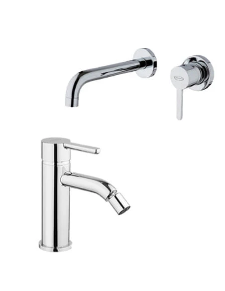 Set rubinetti Jacuzzi per lavabo a parete e bidet serie Sunset con rubinetto miscelatore per lavabo a parete senza scarico art. 0SU00497JA00 e rubinetto miscelatore per bidet senza scarico art. 0SU00092JA01 finiture cromo.