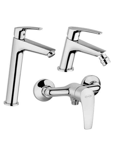 Set rubinetti Jacuzzi per lavabo alto, bidet e doccia esterno serie Lucente con rubinetto miscelatore per lavabo alto senza scarico art. 0LU00493JA00, rubinetto miscelatore per bidet senza scarico art. 0LU00092JA00 e miscelatore esterno per doccia art. 0LU00028JA00 finiture cromo.