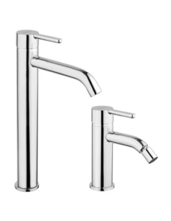 Set rubinetti Jacuzzi per lavabo alto e bidet serie Sunset con rubinetto miscelatore per lavabo alto senza scarico art. 0SU00493JA01 e rubinetto miscelatore per bidet senza scarico art. 0SU00092JA01 finiture cromo.