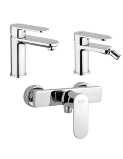 Set rubinetti Jacuzzi per lavabo, bidet e doccia esterno serie Borea con rubinetto miscelatore per lavabo senza scarico art. 0BO00086JA00, rubinetto miscelatore per bidet senza scarico art. 0BO00092JA01 e miscelatore esterno per doccia art. 0BO00028JA01 finiture cromo.
