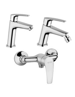 Set rubinetti Jacuzzi per lavabo, bidet e doccia esterno serie Lucente con rubinetto miscelatore per lavabo senza scarico art. 0LU00286JA00, rubinetto miscelatore per bidet senza scarico art. 0LU00092JA00 e miscelatore esterno per doccia art. 0LU00028JA00 finiture cromo.
