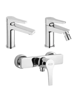 Set rubinetti Jacuzzi per lavabo, bidet e doccia esterno serie Moonlight con rubinetto miscelatore per lavabo senza scarico art. 0MG00086JA00, rubinetto miscelatore per bidet senza scarico art. 0MG00092JA01 e miscelatore esterno per doccia art. 0MG00028JA02 finiture cromo.