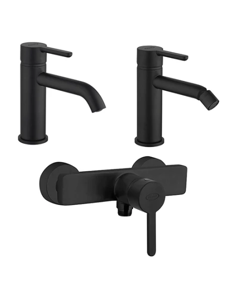 Set rubinetti Jacuzzi per lavabo, bidet e doccia esterno serie Sunset YO con rubinetto miscelatore per lavabo senza scarico art. 0SUYO086JA01, rubinetto miscelatore per bidet senza scarico art. 0SUYO092JA01 e miscelatore esterno per doccia art. 0SUYO028JA01 finiture nero opaco.
