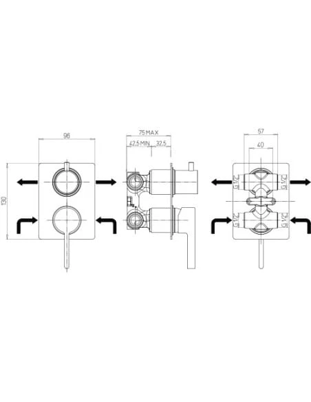 Set rubinetti Jacuzzi per lavabo, bidet e doccia incasso con deviatore serie Fiamma con rubinetto miscelatore per lavabo senza scarico art. 0FM00286JA00, rubinetto miscelatore per bidet senza scarico art. 0FM00092JA00 e miscelatore a incasso per doccia con deviatore art. 0FM00400JA00 finiture cromo.
