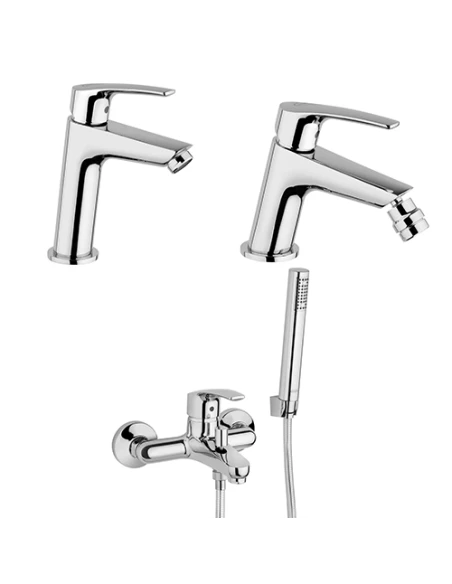 Set rubinetti Jacuzzi per lavabo, bidet e vasca serie Lucente con rubinetto miscelatore per lavabo senza scarico art. 0LU00286JA00, rubinetto miscelatore per bidet senza scarico art. 0LU00092JA00 e miscelatore per vasca con duplex art. 0LU00002JA00 finiture cromo.