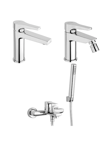 Set rubinetti Jacuzzi per lavabo, bidet e vasca serie Moonlight con rubinetto miscelatore per lavabo senza scarico art. 0MG00086JA00, rubinetto miscelatore per bidet senza scarico art. 0MG00092JA01 e miscelatore a incasso per vasca con duplex art. 0MG00002JA02 finiture cromo.
