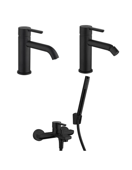 Set rubinetti Jacuzzi per lavabo, bidet e vasca serie Sunset YO con rubinetto miscelatore per lavabo senza scarico art. 0SUYO086JA01, rubinetto miscelatore per bidet senza scarico art. 0SUYO092JA01 e miscelatore per vasca con duplex art. 0SUYO002JA01 finiture nero opaco.