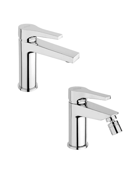 Set rubinetti Jacuzzi per lavabo e bidet serie Moonlight con rubinetto miscelatore per lavabo senza scarico art. 0MG00086JA00 e rubinetto miscelatore per bidet senza scarico art. 0MG00092JA01 finiture cromo.