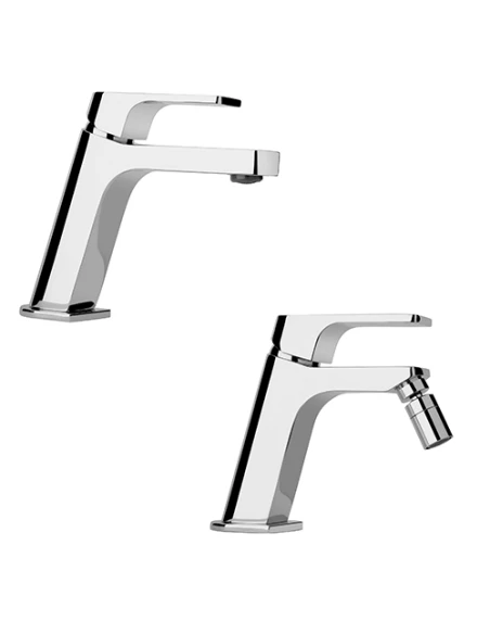 Set rubinetti Jacuzzi per lavabo e bidet serie Twilight con rubinetto miscelatore per lavabo senza scarico art. 0TI00086JA00 e rubinetto miscelatore per bidet senza scarico art. 0TI00092JA00 finiture cromo.