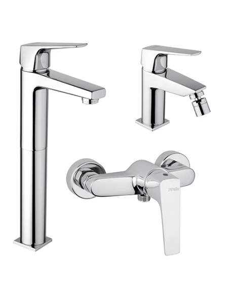 Set rubinetti Piralla per lavabo alto, bidet e doccia esterno serie Iceberg con rubinetto miscelatore per lavabo alto con scarico automatico 1”1/4 art. 0IC00488A22, rubinetto miscelatore per bidet con scarico automatico 1”1/4 art. 0IC00094A22 e miscelatore esterno per doccia art. 0IC00028A22 finiture cromo.