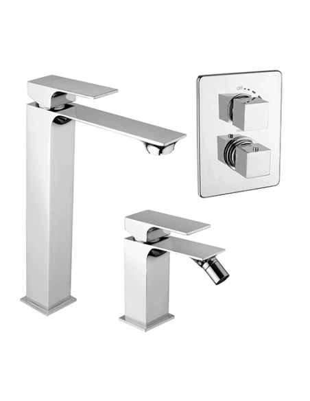 Set rubinetti Piralla per lavabo alto, bidet e doccia incasso serie Artic con rubinetto miscelatore per lavabo alto con scarico automatico 1”1/4 art. 0AC00488A22, rubinetto miscelatore per bidet con scarico automatico 1”1/4 art. 0AC00094A22 e miscelatore a incasso per doccia art. 0AC00410A23 finiture cromo.