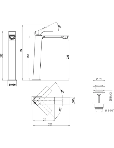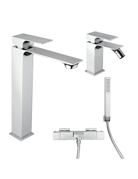 Set rubinetti Piralla per lavabo alto, bidet e vasca serie Artic con rubinetto miscelatore per lavabo alto con scarico automatico 1”1/4 art. 0AC00488A22, rubinetto miscelatore per bidet con scarico automatico 1”1/4 art. 0AC00094A22 e miscelatore per vasca con duplex art. 0AC00002A22 finiture cromo.
