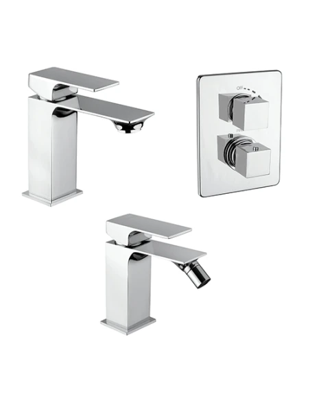 Set rubinetti Piralla per lavabo, bidet e doccia incasso serie Artic con rubinetto miscelatore per lavabo con scarico automatico 1”1/4 art. 0AC00088A22, rubinetto miscelatore per bidet con scarico automatico 1”1/4 art. 0AC00094A22 e miscelatore a incasso per doccia art. 0AC00410A23 finiture cromo.