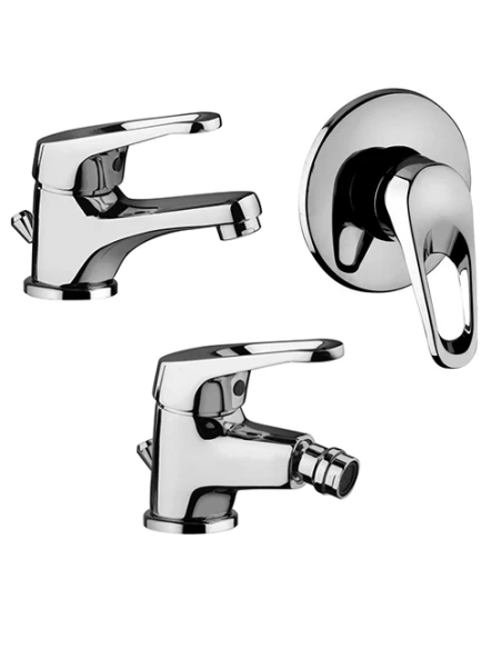 Set rubinetti Piralla per lavabo, bidet e doccia incasso serie Naomi con rubinetto miscelatore per lavabo con scarico automatico 1”1/4 art. 0NO00088A16, rubinetto miscelatore per bidet con scarico automatico 1”1/4 art. 0NO00094A16 e miscelatore a incasso per doccia art. 0NO00410A16 finiture cromo.